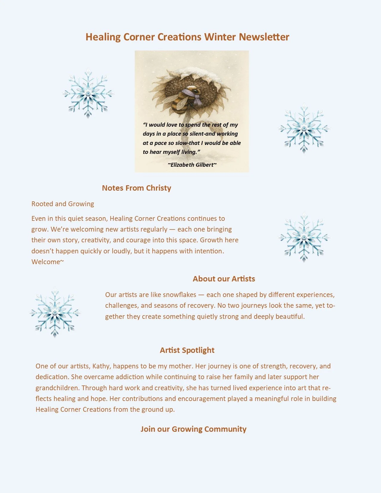 Healing Corner Creations is a NEW recovery-based artist collective and online marketplace dedicated to supporting individuals who use creativity as part of their healing journey. We provide a safe and empowering space for artists in recovery to share and sell their handmade jewelry, artwork, and meaningful creations. Through professional marketing, website listings, and social media promotion, we help artists gain visibility and confidence while building a supportive community centered on hope, unity, and purpose.
